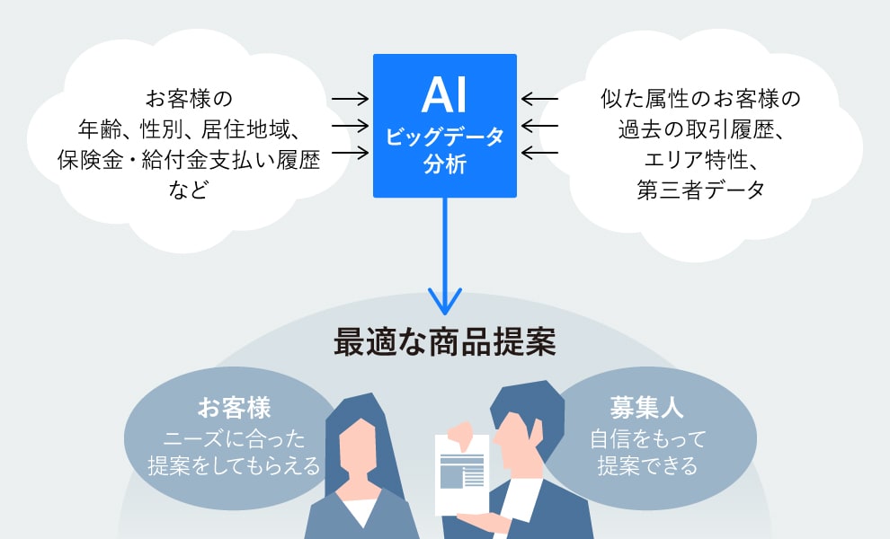 一例として、お客様への最適な提案商品の推定モデルが挙げられます。アフラックでは、全国各地の代理店に所属する募集人(注2)がお客様との接点を持ち、保険商品を販売しています。どのお客様に電話をしてアポイントを取り、どのような商品を提案するかという判断は、これまでは各募集人の経験値に依る部分が大きかったんです。そのため、新しく募集人になった人や担当エリアが異動になった募集人が既存顧客リストを渡されても、「誰に何を提案すべきかわからない」というケースがありました。