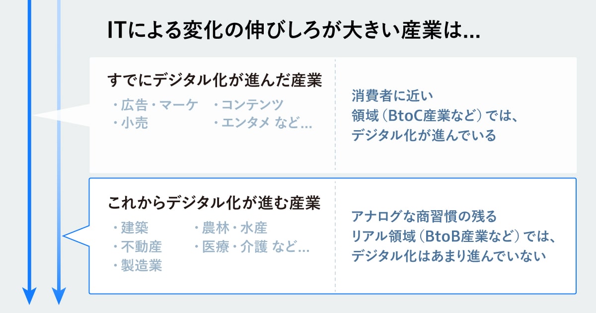 では、これから変革が起こる見込みのあるアーリーフェーズの領域はどこなのでしょうか。今後も世の中はITによって大きく変化していくと言われていますが、広告・小売・コンテンツなどの消費者に近い領域では比較的デジタル化が進んできました。一方で、ITによる変化の伸びしろが大きいのが、アナログに基づいた法規制や商習慣が根強く残る、昔ながらのBtoB産業です。