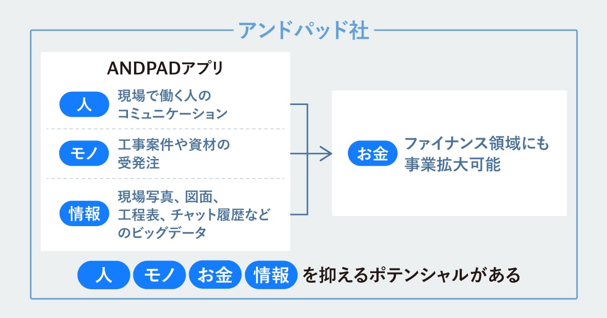 その点、現場のコミュニケーションを抑えるANDPADは「人」のおさえ方が本質的であると感じました。また、「モノ」や「お金」の面でも、ANDPADはバーティカルSaaSと言われる産業特化型のSaaSであり、実は「モノ」をANDPAD上で受発注する領域や、ファイナンス領域に事業拡大することも可能なビジネスモデルです。それが実現できれば、「人」「モノ」「お金」、そしてアプリケーションに溜まる「情報」の全てをおさえることができます。