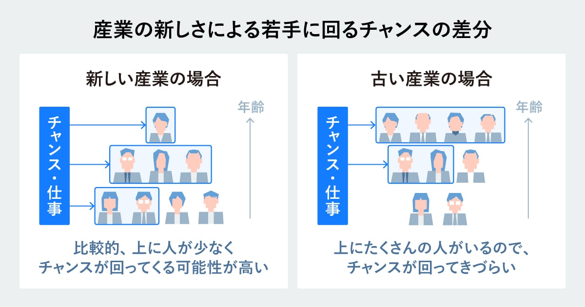 反対に古い産業では人口ピラミッドは逆三角形になり、上にたくさんの人がいるのでポジションが詰まってしまい、皆さんがチャンスを掴むまでに時間がかかりますし、事業の収益が退職したOB・OGに回ってしまうこともあります。