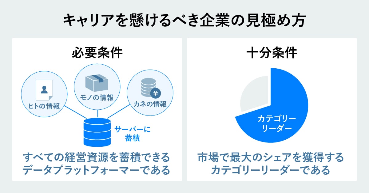 そして十分条件には、カテゴリーリーダーであることが挙げられます。第四次産業革命では一つのサーバーの中に特定の産業や領域のすべてのデータが入っている状態が好ましいです。例えば、ある産業の中で10社が10%ずつ情報を持っているとします。それらの少ない情報では、AIが正しく解析することは難しいでしょう。一方、80%のデータを持つカテゴリーリーダーが存在すればどうでしょうか。それだけのデータ量があれば、AIを用いてより有用な解析をすることができ、その産業で働く人々にとって一層価値の高いサービスを提供することにも繋がります。