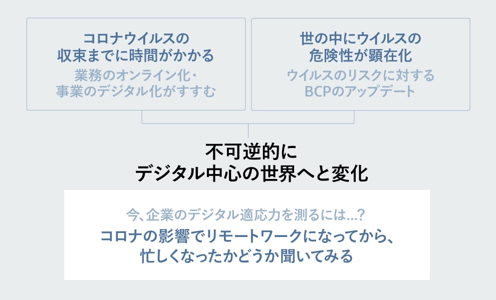 また、今回の新型コロナで、ウイルスの危険性が世に示されてしまい、バイオテロやコロナより怖いウイルスが出現した場合のリスクも想定されるようになりました。企業の危機管理においても、いわゆるBCP※1のアップデートが進むこともあり、ますますデジタル中心の世界となっていくと考えられます。デジタルに適応できていることが、企業が存続するための前提条件となるでしょう。