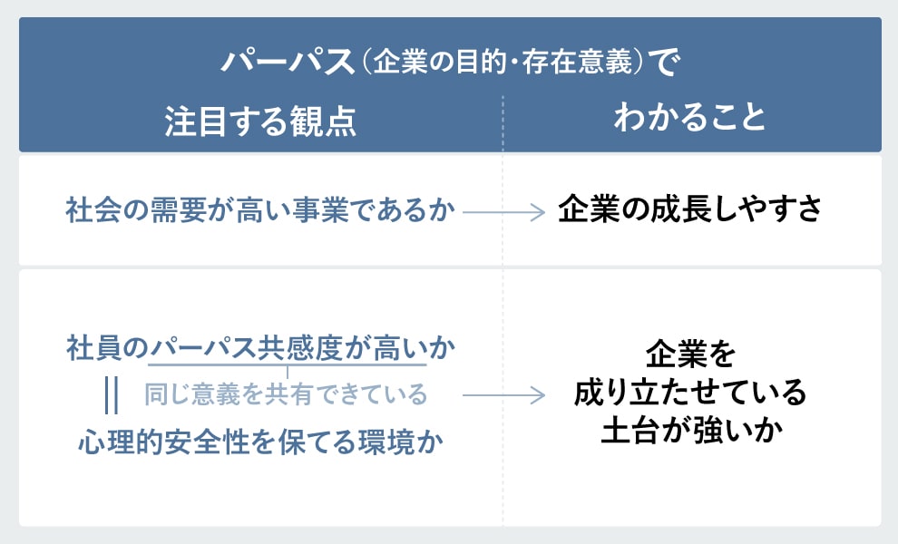 最後のパーパスは、企業の目的、存在意義という意味です。普遍的に重要な観点ではありますが、パーパスが社会の需要とマッチしていて生き残れそうなのか、自分が共感出来て気持ちよく働けるのかどうかは、改めて重視すべきだと思います。