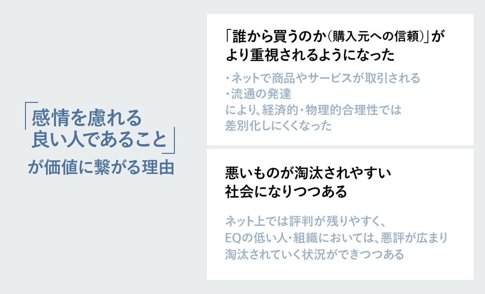 現在、モノやサービスの価格はWEB上ですぐに把握することができますし、流通も発達しており、世界中のどこにある商品でも届けてもらうことができます。そうなると、経済的・物理的合理性だけでは差別化が難しくなっており、顧客は「誰から買うのか」をより重視するようになります。「この人は裏切らないし、法外な価格で売らない」という信頼を獲得できるのかが、ビジネスを行う上での鍵になるのです。
