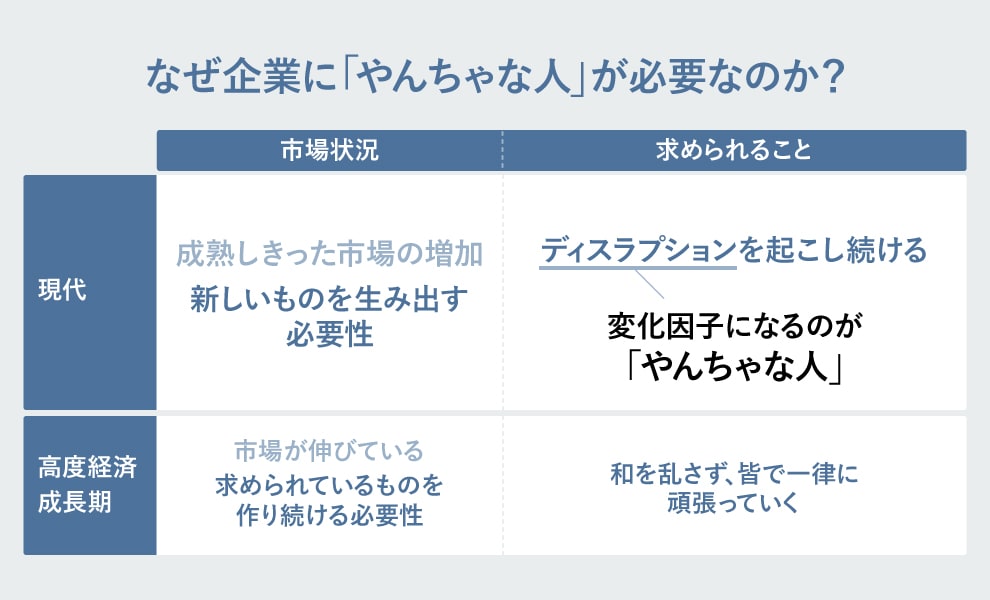 高度経済成長期は市場が伸びていたので、和を乱さず、皆で一律に頑張っていくことが戦略的にも正しい時代でした。しかし、成熟しきった市場も多く、新しいものを生み出す必要がある現在、変化因子となる「やんちゃな人」を採用しないと、ディスラプションできず、どこかで成長が止まってしまいます。