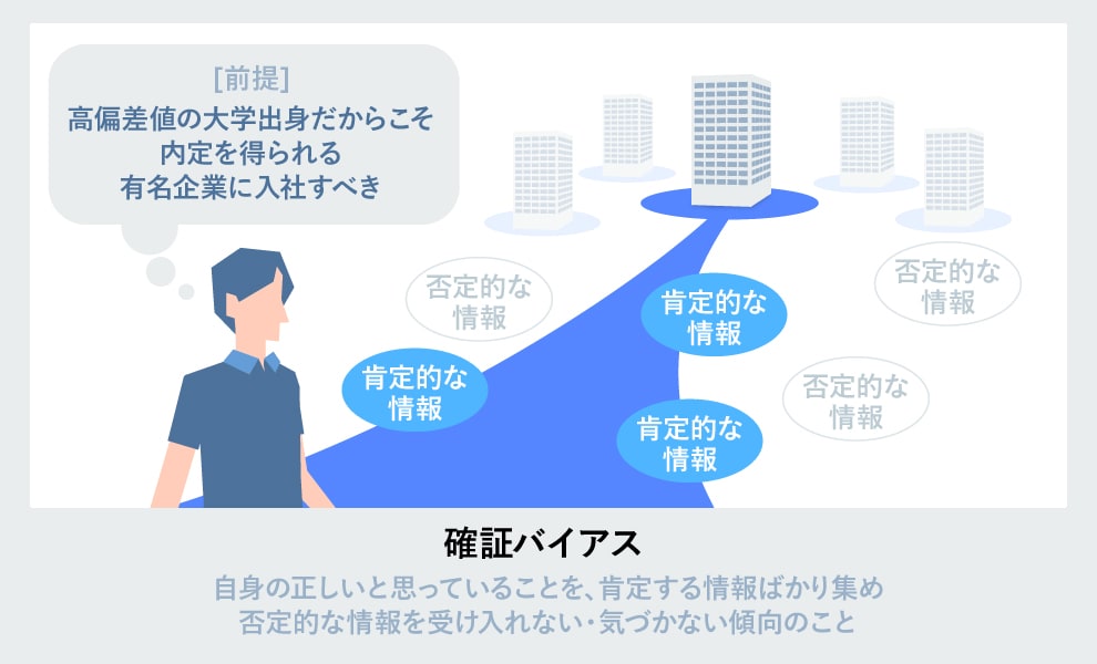 伊藤:受け取る側のバイアスは、まさに「確証バイアス」のことですね。よくある事例でいうと、高い偏差値の大学出身だからこそ内定を得られる有名企業に入社すべきだ、という前提を置き、有名な難関企業を目標にロックオンして、その会社に関する良い情報しか受け入れないことなどでしょうか。例えば、外コンは就活市場において人気がありますが、入社することを正当化するために、他の選択肢やマイナスの情報は受け入れず、外コンを支持する情報ばかり集めて固執してしまうという学生の方は、多くいらっしゃいますね。