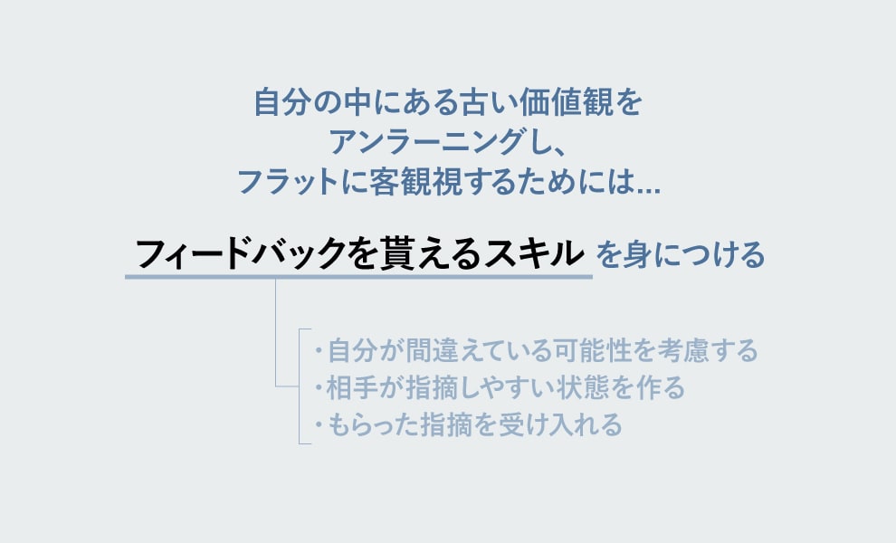 そこで必要となるのは、フィードバックを貰える力です。自分が間違っている可能性があるという姿勢を持ち、相手からフィードバックを得られるということもスキルの一つだと思います。指摘してもらえる状態でいる、そしてそれを受け取れることは、一生使える、強い武器になるはずなので、今から身につけてもらえると良いかと思います。
