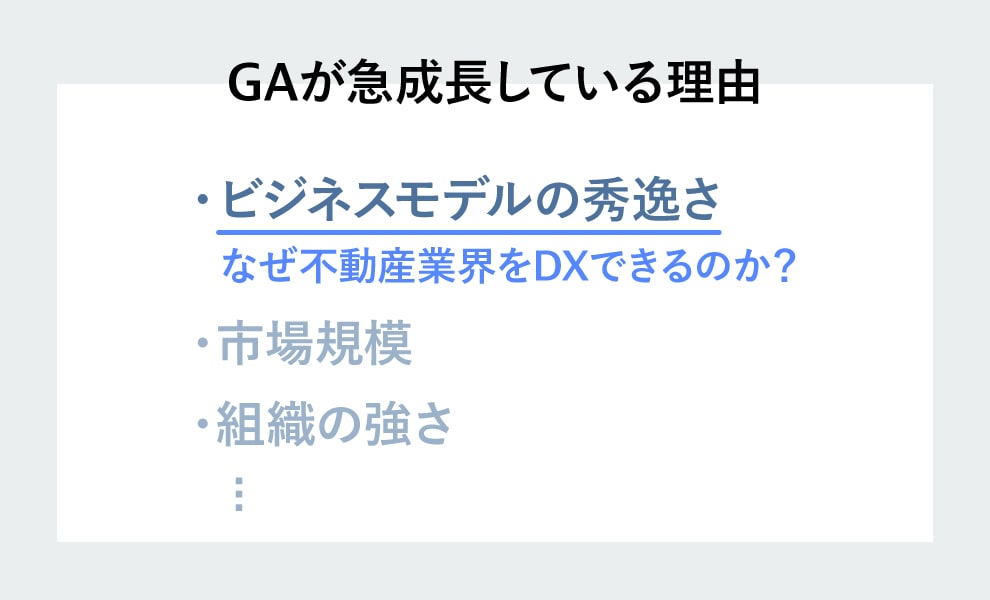 GAが急成長している理由は、ビジネスモデルの中でも次の2つと、編集部では読み解きました。