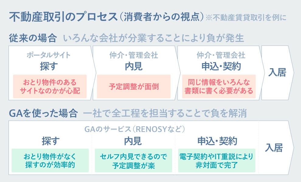 そこでGAではAmazon同様、一貫して事業を展開しようとしています。これにより、消費者の抱えていたおとり物件※2 への不安や取引プロセスでの負担を軽減することができ、最高の不動産体験ができるといった流れになっています。