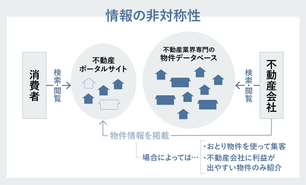 日本の不動産業界では様々な課題が存在します。例えば情報の非対称性や、テクノロジー化の遅れです。「情報の非対称性」とは、物件データベースを閲覧できる不動産会社と、閲覧できない消費者との間の情報のギャップです。そのために、いわゆる「おとり物件」で集客する業者がいたり、不動産会社に利益が出やすい物件のみを紹介することで消費者の適切な判断が妨げられたりしています。
