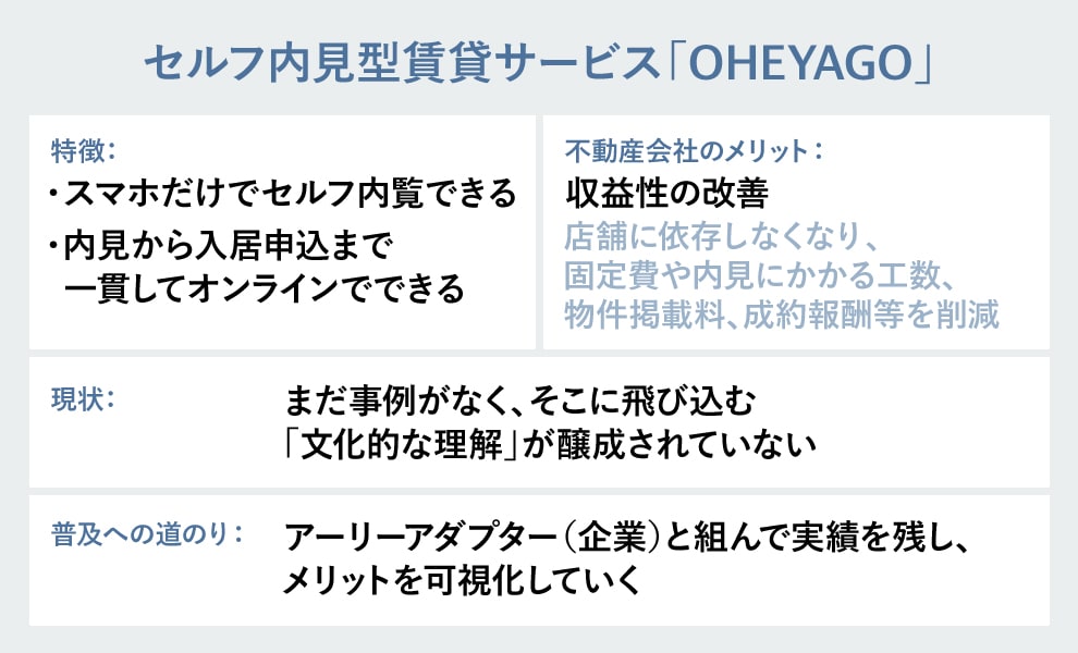 野口:そういったケースの場合、マインドの変化や文化的理解を得るために、アーリーアダプターとなりうる不動産会社と共に実績を築き、セルフ内見型賃貸サービス「OHEYAGO」を利用することのメリットを可視化していくことが必要だと考えます。