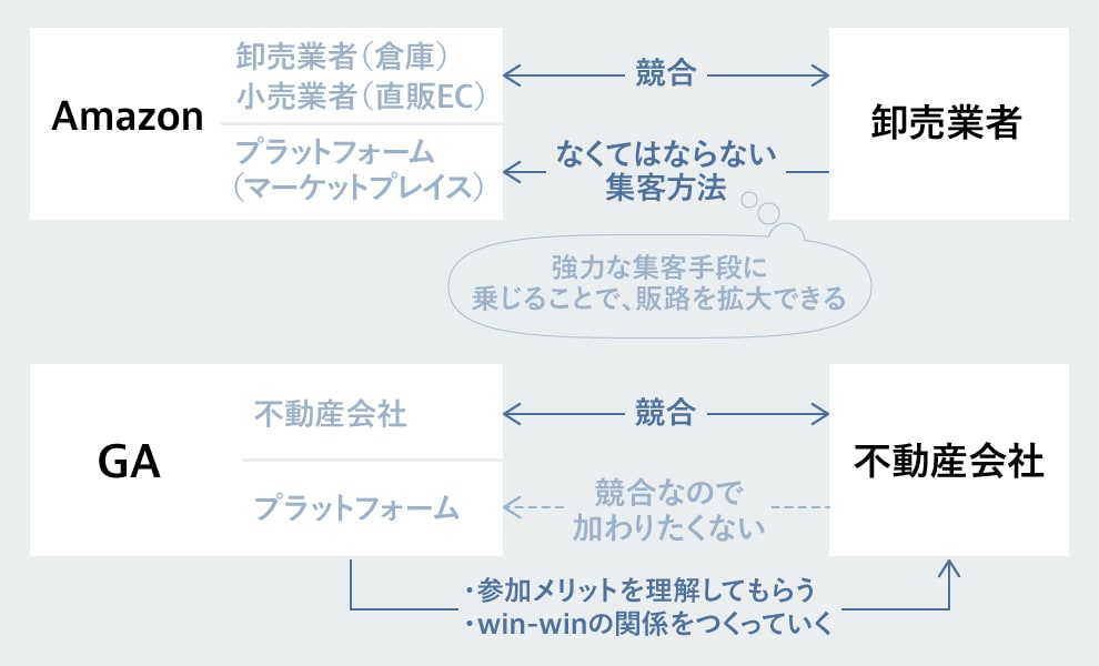 野口:実は、我々GAが不動産会社にサービスを提案することと、Amazonが卸売業者に対してプラットフォームへの参加を促してきたことには、近い構造があります。