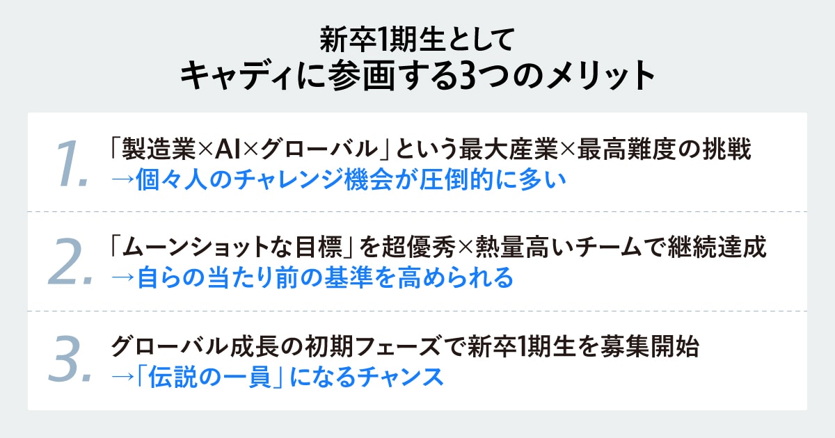 その理由は大きく3つあります。1つ目は「前例のない挑戦の大きさ」、2つ目は「自らを引き上げてくれる組織」、3つ目は「第二創業期という今だけのフェーズ」です。
