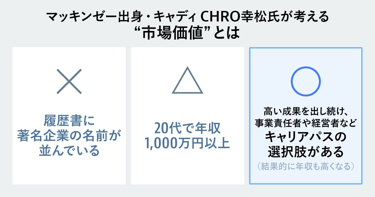 幸松:多くの学生が、「履歴書に著名企業の名前が並ぶこと」や「高い年収を得ること」を、市場価値の高さだと捉えがちなのではと感じます。しかし、CHROとして断言しますが、「人材市場」における「価値」の尺度として本当に重要なのは「どの会社にいたか」「いくら稼いだか」よりも、「自分が何を成したか」にあります。