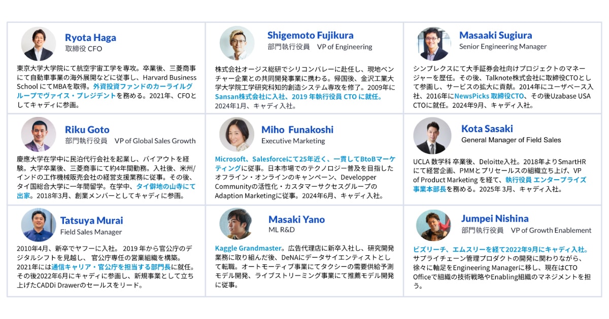 AI×グローバル×製造業という難度の高い領域で急成長を遂げる同社から今回、CHRO幸松氏(元マッキンゼー・アンド・カンパニー)、USマーケティングを担当する西村氏(東京大卒、UCLA休学中に第二新卒入社)、キャディに新卒入社後、プロダクトマネージャー(PdM)を務める後藤氏(東京大卒、22年新卒入社)の3名が登場。