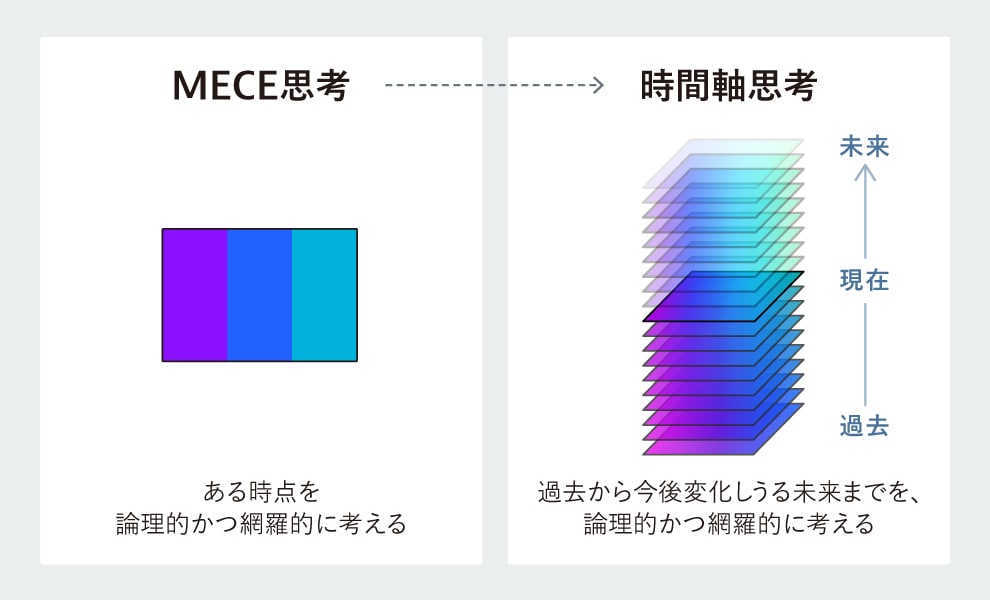 自身のキャリアの可能性を広げるために、ぜひ知っておいてほしい2つの考え方があります。1つ目は「時間軸思考」。世の中の事象を論理的、網羅的に把握するための考え方としてMECE(もれなくダブりなく)などが普及していますが、そこに「時間」という軸を加えて、立体的かつ動的に捉えようとする思考のことを「時間軸思考」といいます。