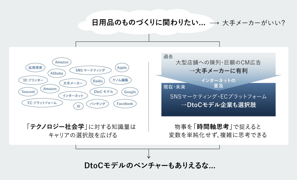 最後に一つ、時間軸思考とテクノロジー社会学の有用性の例を挙げます。例えば、日常的に人々が消費するものづくりに関わりたいと思っている人の多くは、大手メーカーを志望するでしょう。しかし大企業がメーカーとして圧倒的に有利だったのは、大規模な店舗の棚に商品を並べてCM広告を大々的に打たなければ、消費者に届かなかった過去の話です。また、インターネットの普及とともに日用品マーケットは激変し、ECプラットフォームやSNSマーケティングは当たり前、実店舗や巨額の広告費は必ずしも必要ではなくなります。