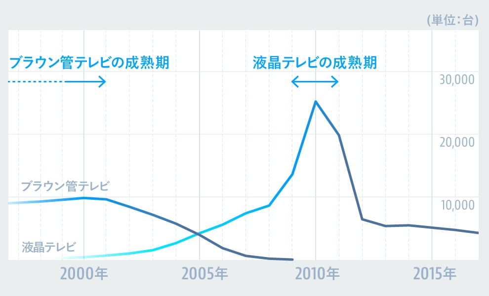 テレビを例にとって考えてみます。ブラウン管テレビは1970年代に普及後、薄型液晶テレビが登場するまでの約30年間、安定した生産が続きました。しかし、ブラウン管テレビの後継として現れた液晶テレビは2010年にピークを迎えた後、一気に生産量が激減し衰退していったのです。