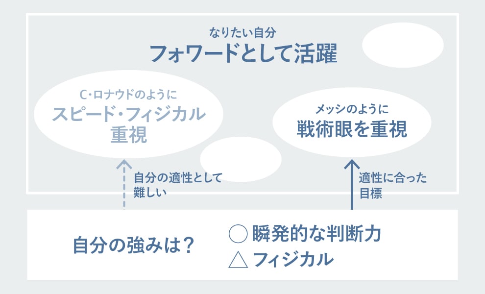 しかし視野を広げてみれば、別の選択肢だってたくさんあるはずです。たとえC・ロナウドのようにスピードとフィジカルの強さでゴールを奪い取ることができなくても、メッシのように戦術眼やボールコントロールを駆使して貢献する方法だってあるはずです。