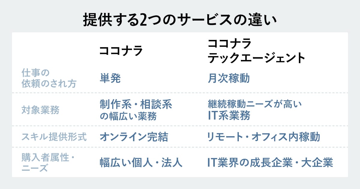 ココナラのミッション・ビジョン実現のためには、より多くの方にスキルマーケットとしてのココナラ(以降「スキルマーケット」)を使ってもらうのが一番いいものの、このプラットフォームだけでは出会えない方がいるのが現状です。IT人材と業務委託紹介の新規事業を行うことで、私たちが出会える個人や企業が増え、スキルマーケットに新たな価値を提供するといったシナジーが期待できるのです。