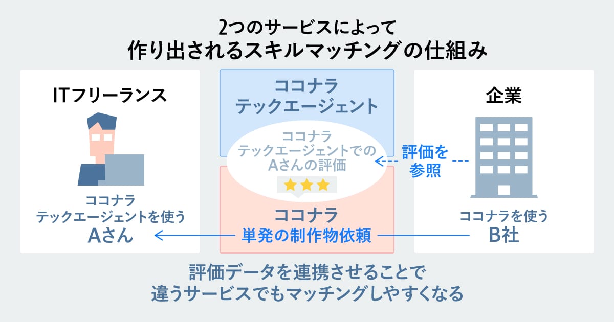 また、2つのサービスの口コミや取引評価のデータは連携しているため、例えばスキルマーケットは使ったことがないけれどココナラテックエージェントは使ったことがある、というフリーランスの方にとって、評価が双方のプラットフォームに反映されることで、スキルマーケットで新規出品する際に優位になり、お取引につながる可能性が高まります。