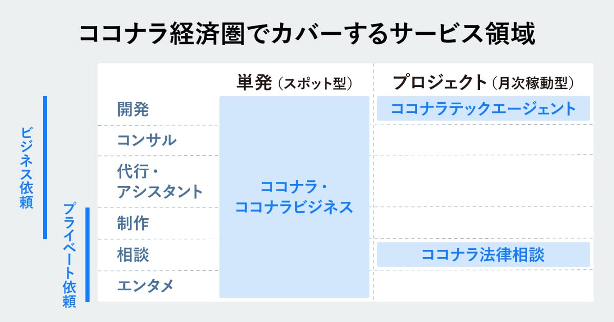 ココナラでは、提供するサービス領域やマッチング手法の広がりを「ココナラ経済圏」と表現しています。ココナラテックエージェントは、スキルマーケット「ココナラ」とは役割が異なりますが、私たちの目指す世界観をココナラとして一気通貫で実現するための取り組みでもあります。