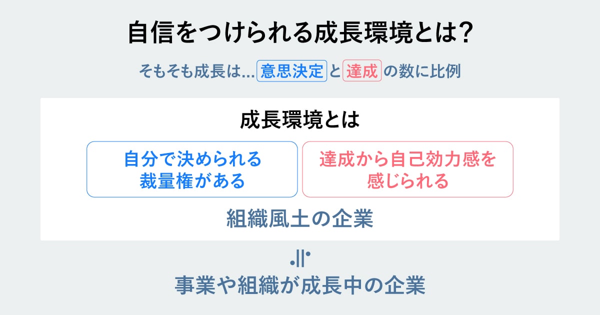 成長は自分で決めたことの達成数に比例するので、まずは自分で決められる裁量権がある環境に行くのがポイントです。そして、そういう組織風土やカルチャーがあるのは、ほとんどが事業や組織が成長中の企業なんです。