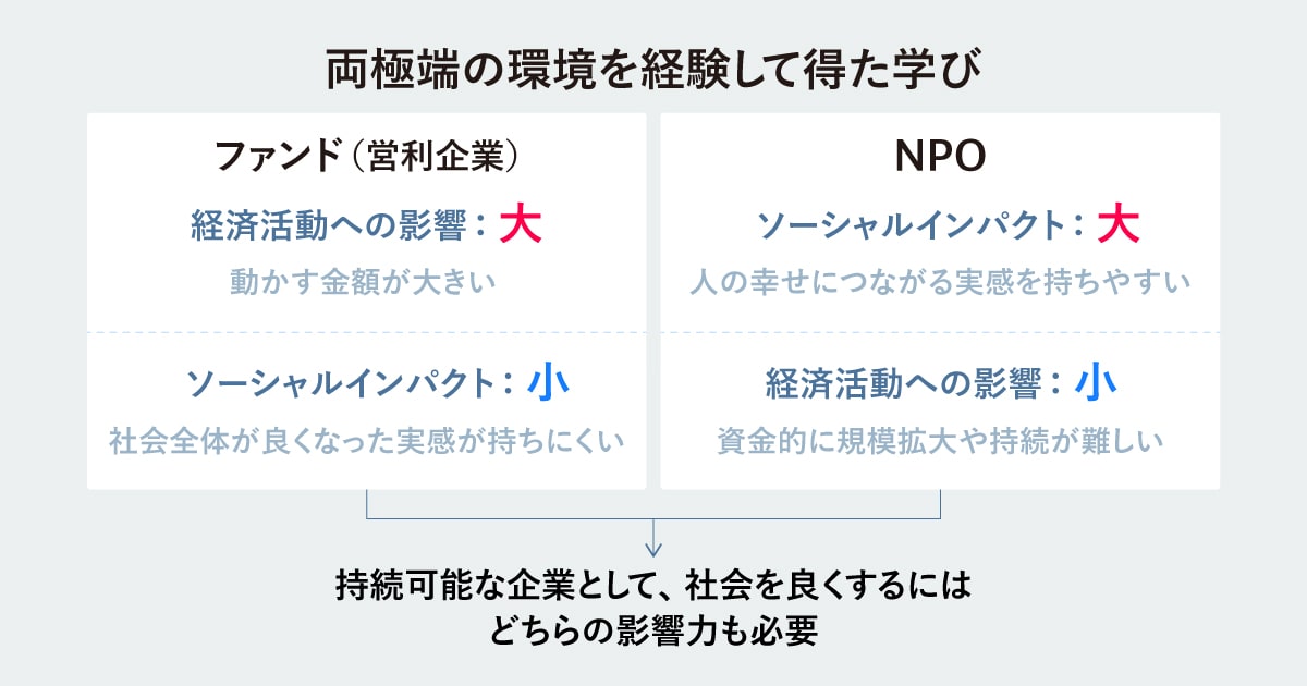 南:ファンドとNPOという両極端の環境で得た学びは、経済活動と社会貢献の両方を同時に達成できるような強い企業を作らなければ、世の中は変えられないということでした。経済活動への影響力とソーシャルインパクトの大きさ、どちらが欠けてもうまく行かないわけです。