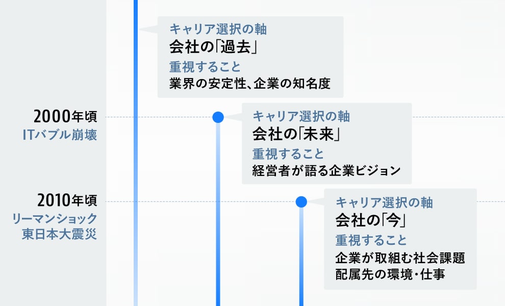 その後、リーマンショックや東日本大震災が起きた2010年前後を境に、再び学生のキャリア観が変化しはじめます。社会課題を意識して企業を選ぶ傾向が強まると同時に、「どんな人と一緒に働くのか」「1年目の配属先はどこで、どんな仕事をするのか」といった、「会社の今」を重視する就活生が増えました。