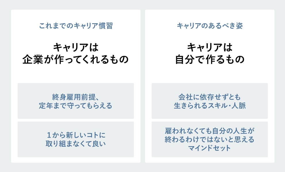 私は仕事柄よく「これからは転職が当たり前になる」という話をするのですが、自分自身は20年間で1度も転職をしたことがありません。しかし、それもまたキャリアの在り方の一つだと考えています。つまり、転職はあくまで手段であって、重要なのは「自分のWill」をもとにキャリアを築いているかどうかです。