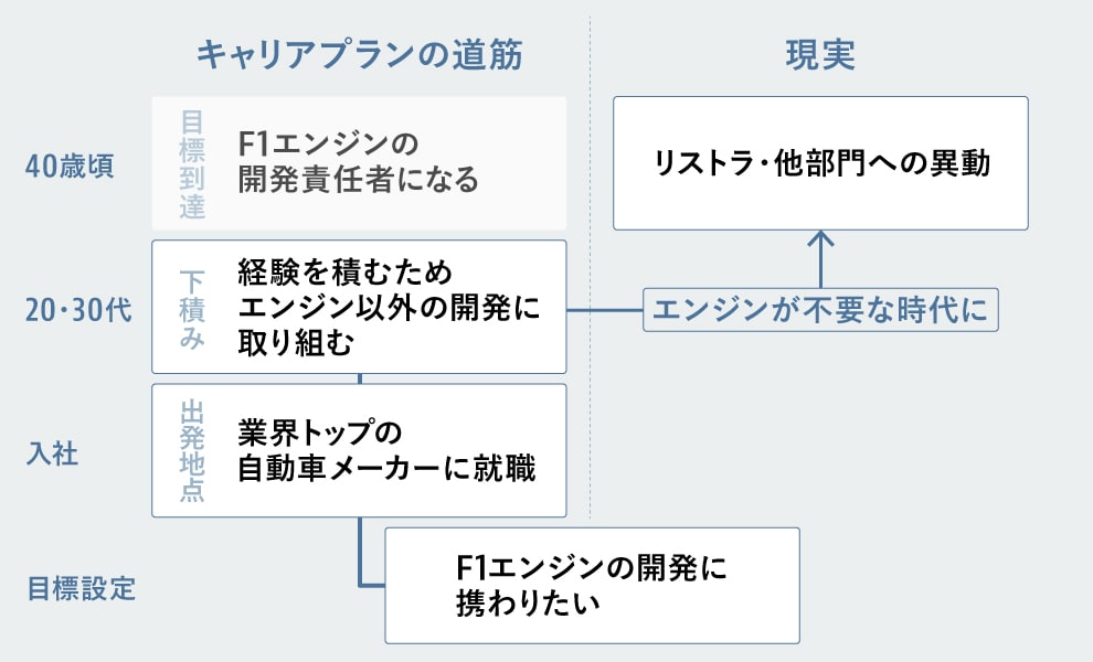 例えば、「40歳でF1カーのエンジン開発責任者になる」ことを夢みて一流大学を卒業したとします。その夢を実現するために業界トップの自動車メーカーに就職し、先輩のキャリアを参考に「その人が通ってきた道だから」「一番の出世コースだから」と、20代、30代は興味がない分野の開発に携わりながら経験を積む。そうして、ようやくエンジンの開発に携われるようになった時には、もう車のエンジンは必要なくなり、全ての車が電気で動く時代になっているかもしれません。