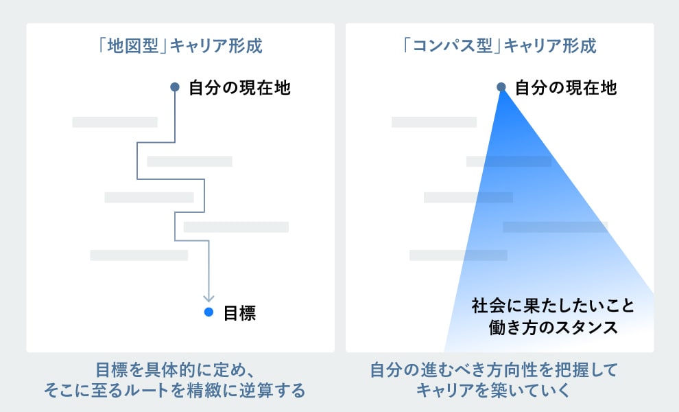 だからこそ「何を社会に果たしたいのか、どんなスタンスで働きたいのか」という、『自分が人生をかけても取り組みたいと思えるテーマ』を目指して進む、「コンパス型」のキャリア設計が大きな意味を持つのです。