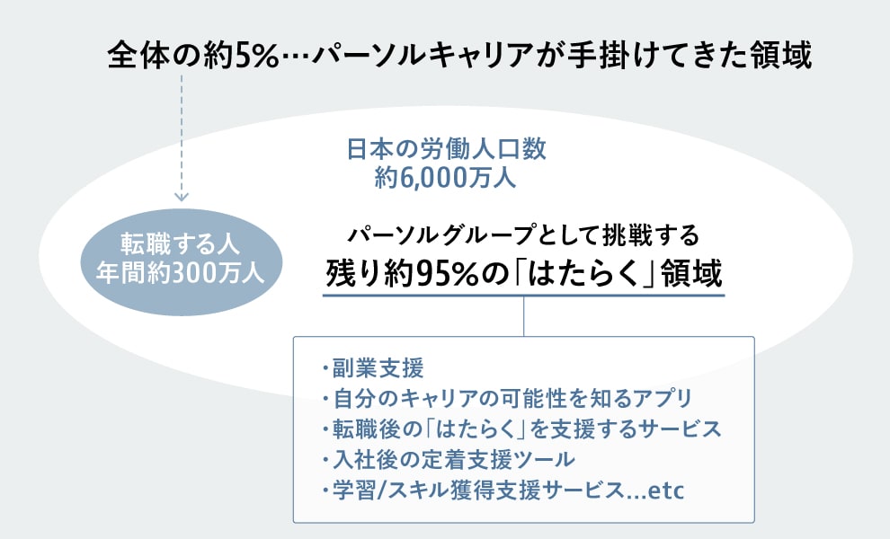 日本の労働人口が6,000万人以上いるのに対し、転職する人はあらゆる雇用形態を含めて年間約300万人。仮に転職者全員にサービスを提供したとしても、日本の労働人口のうち約5%ほどです。約5%の非日常的な「はたらく」にしか携わることができないのであれば、「はたらいて、笑おう。」というビジョン実現には程遠いでしょう。ですから今後は、残りの約95%の日常的な領域でどれだけ事業を拡張させ、パーソルグループが「転職とは関係なく相談したいと思える存在」になれるかが重要だと考えています。