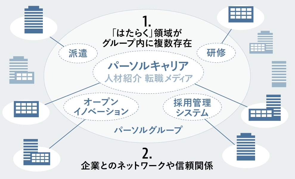 一つ目は、パーソルグループの中に、人材紹介事業や派遣事業、教育研修事業など、「はたらく」にまつわる複数領域が既に存在していることです。「正社員領域のみ」「中途採用タイミングのみ」のように特定の働き方や領域に限定することなく、グループ全体で「はたらく」に柔軟にアプローチできるのは、私たちならではだと考えています。