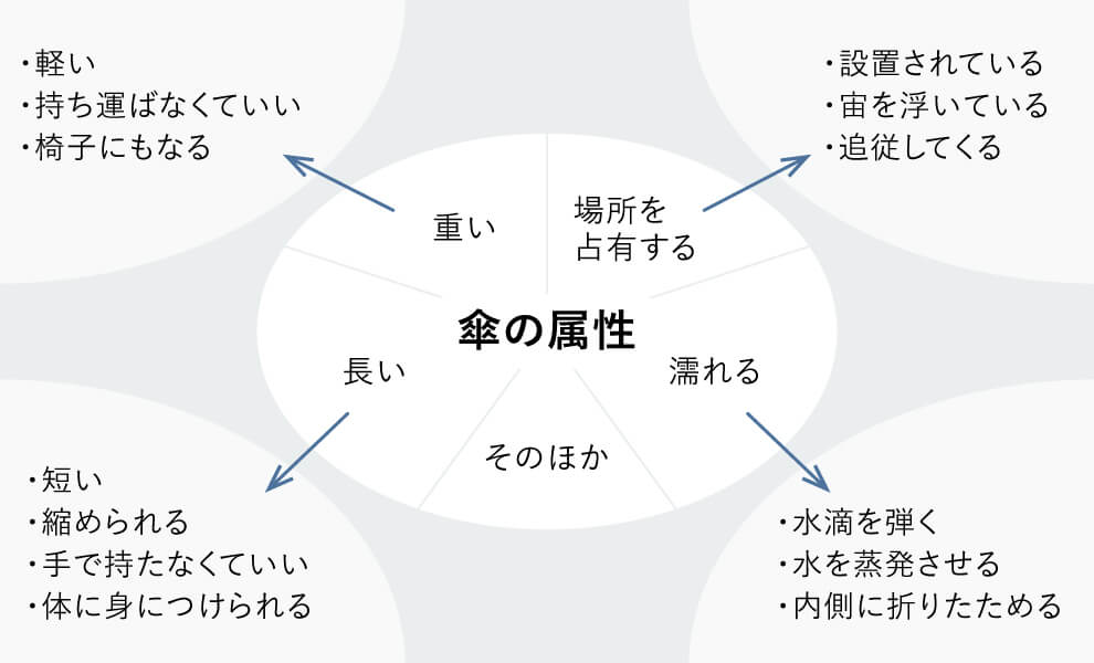 (例)傘の属性:長い、重い、濡れる、邪魔である