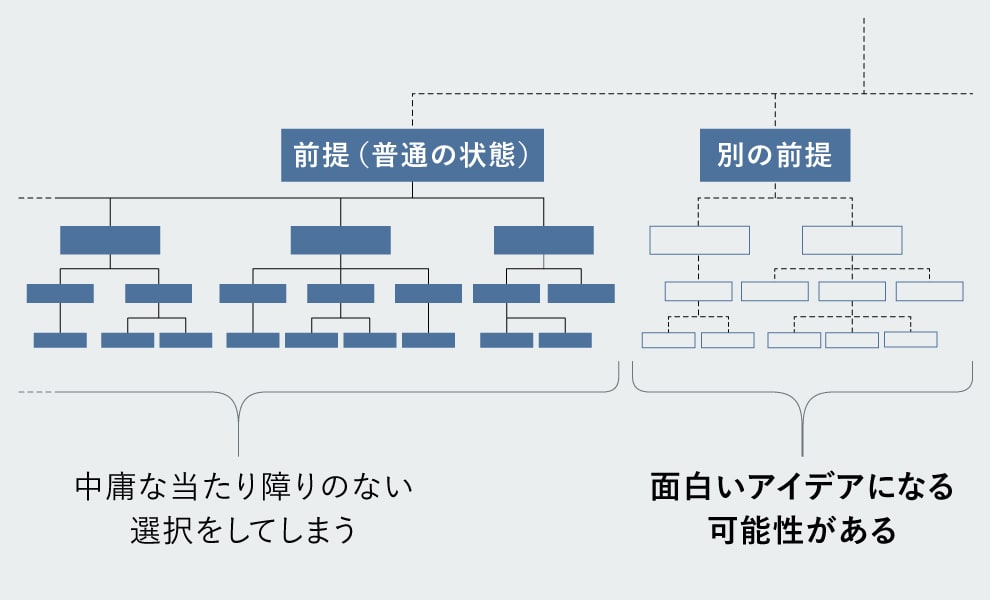 自分の解こうとしている課題について、その制約条件となる前提をあえて外し、逆転することで、有意義なアイデアを生み出す方法です。一般的に考えられるロジックツリーのさらに上位概念を探り、通常なら思考が介在しづらい前提条件をメタ的に捉え変化させます。