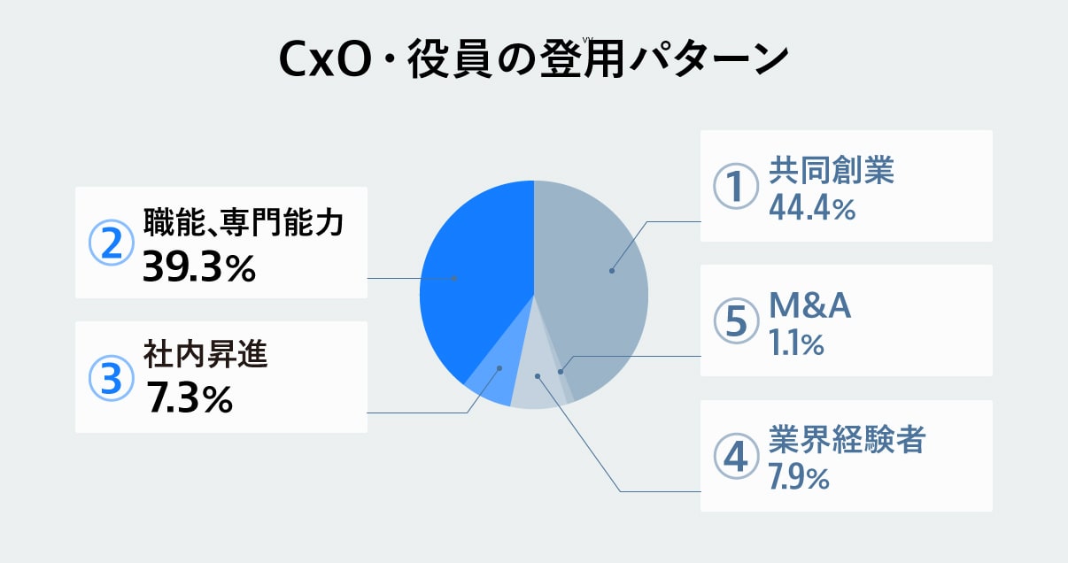 「すごいベンチャー100」に掲載されている企業には289名のCxO・役員が存在するが、そこからCEO・代表取締役を除いた182名の登用パターンは、下記の通りだ。