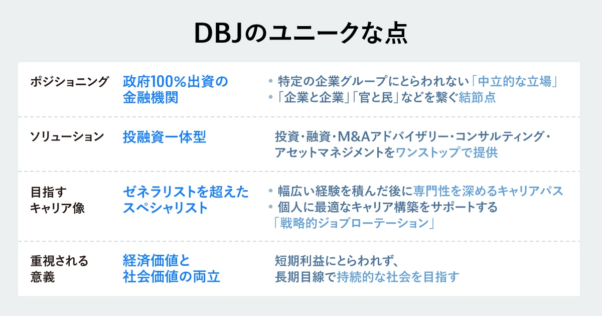 DBJは、金融分野のフロンティアを切り拓き日本の未来を創る、という使命を持つ政府系金融機関です。長期的なプロジェクトに対し投融資を行うほか、コンサルティングやM&Aアドバイザリーなども幅広く行い、金融インフラとして日本の社会と産業を支えています。