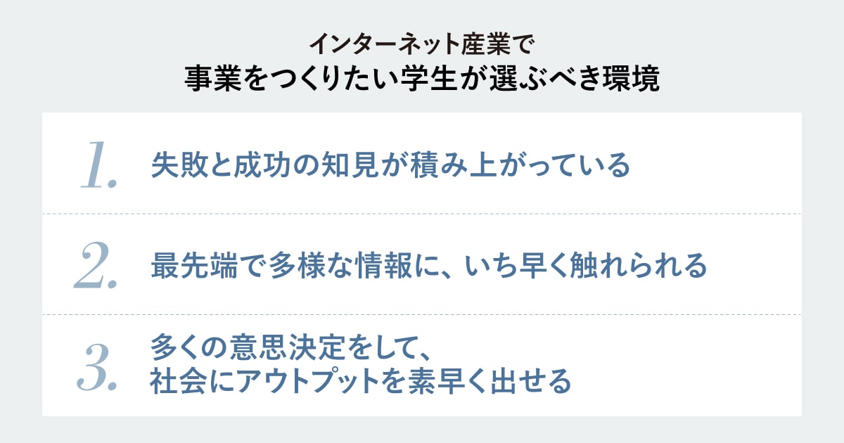 一方で、まだ事業をつくったことはない優秀な学生が、いかに世界の最先端と向き合っていくのかを考えると、特にインターネット産業であれば知見が積み上がったまさにDeNAのような環境をおすすめします。