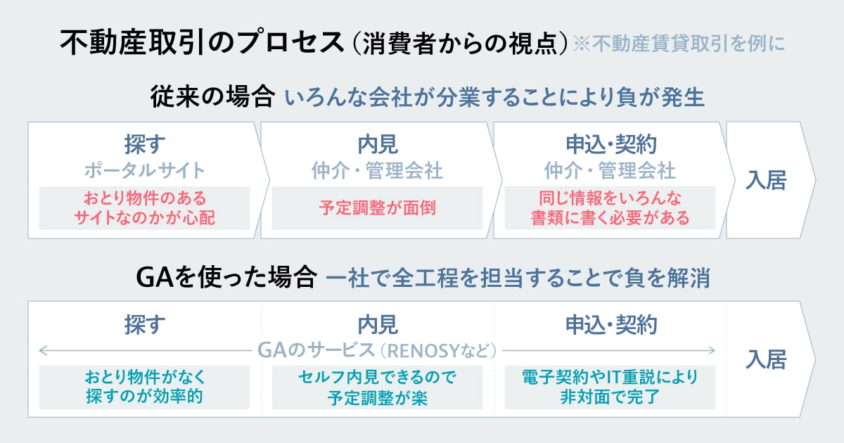 例えば不動産賃貸の取引においては、物件探しから入居までに複数の企業からばらばらにサービスを受けることになり、消費者の手間が増えるという課題が生じています。GAはこの課題を、自らが一貫して事業を展開し、アナログな業界をDXで変革することで解決しようと考えたのです。