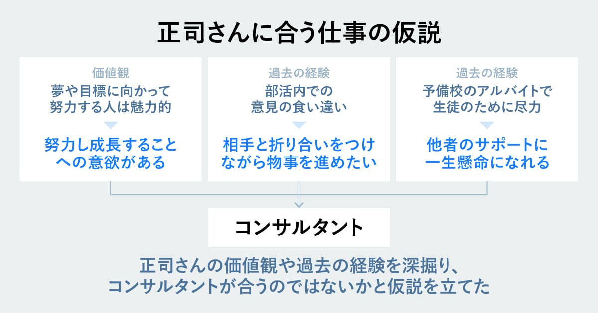 そうしたエピソードから正司さんが大切にしている価値観や、他者のサポートに一生懸命になれること、努力し成長することへの意欲などを見て取り、コンサルタントが向いている可能性があるのではとお伝えしました。