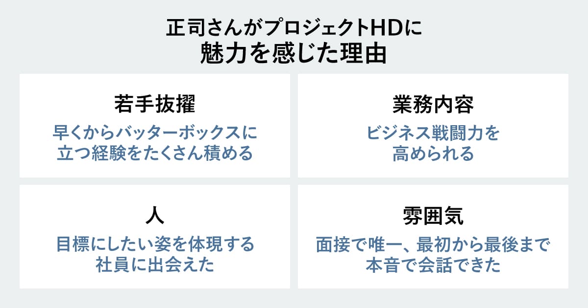 正司:複数社紹介してもらい選考が進む中、プロジェクトHDの最初の面接で「自分に合いそうだ」と感じました。大きな理由としては3点あり、1点目が若手を抜擢するカルチャーがある会社なので、早くからバッターボックスに立つ経験をたくさん積める点。2点目が、幅広い業界のクライアントに入り込むことで、高いビジネス戦闘力(実行推進力)を身につけられる点です。