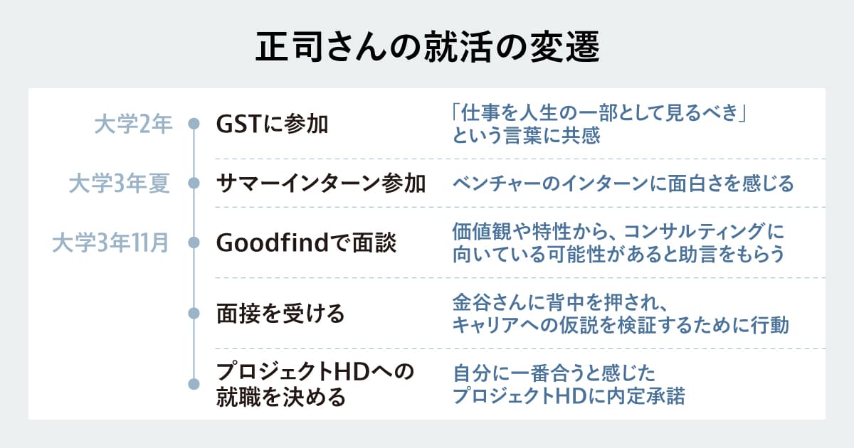 正司:正直「本当に外資系や大手でなくて良いのか?」と迷いはありました。自分の中ではプロジェクトHDが良いと思っていましたが、やはり周りはそうした会社に行く人ばかりだったのが不安で。実は最終面接前の金谷さんとの面談で、もう一度自分の考えを整理する時間をつくってもらいました。
