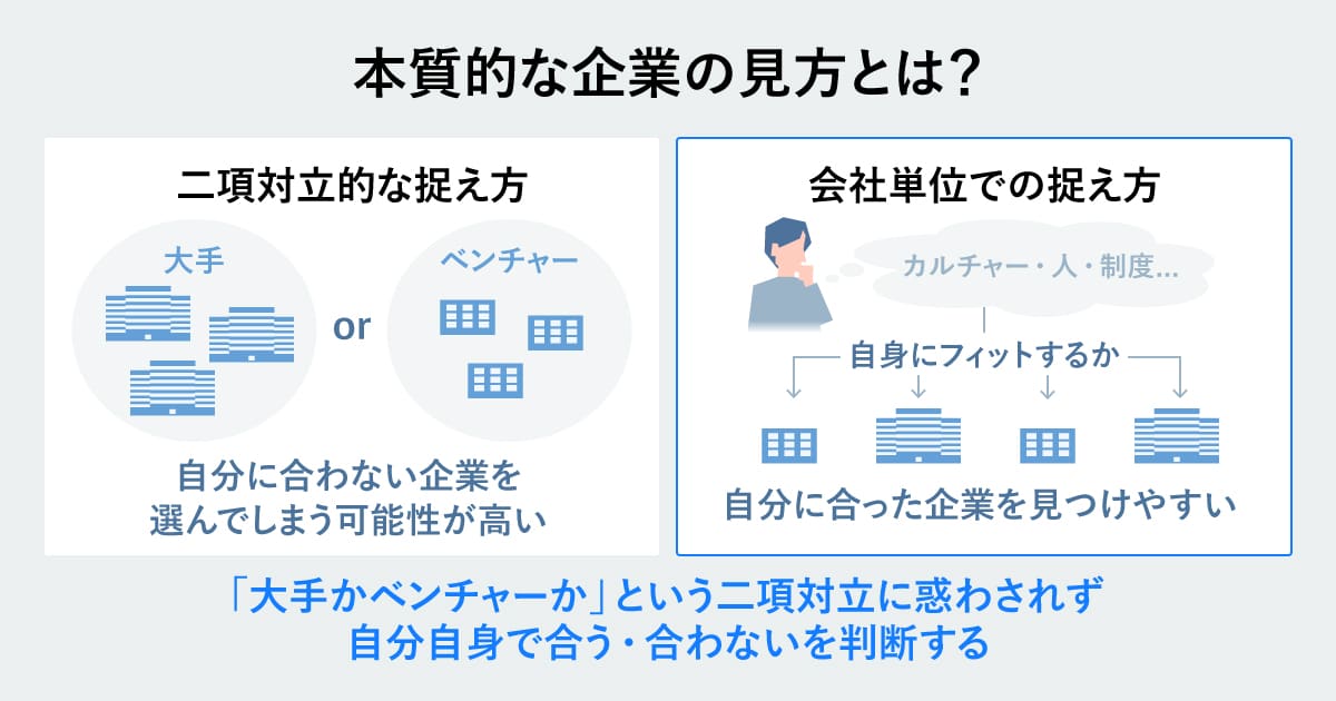 正司:世間一般では「大手かベンチャーか」という切り分けがされていたので、私自身そこに重きを置いて悩んでいましたが、実際に社会人になってみて、この区分には意味がないことがわかりました。大手でもベンチャーでも、人やカルチャー、制度は会社ごとにまったく異なるので、規模ではなく会社単位で見る必要があるんですよね。