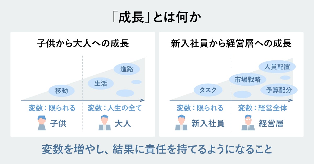 ビジネスの世界でも同様です。新入社員が指示通りに作業をこなすのに対し、リーダーや経営層は、目標設定・予算配分・人員配置・市場戦略など経営全体の変数を決め、その成否の責任を負います。成長とはこのように自分で変数を設定し、その結果の責任を引き受けながら社会に与える影響を大きくしていくプロセスなのです。
