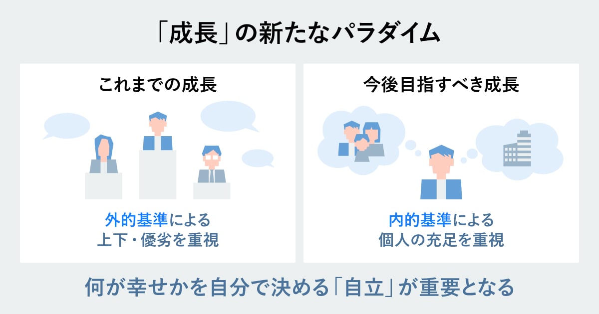 川村:「拡大」や「発展」を追い求めるものから、個人の「充足」や「満たされること」を重視するウェルビーイングへと「成長」の範囲が広がっていくと思います。そして、何が幸せかを自分で決める「自立」が、より重要になっていくでしょう。