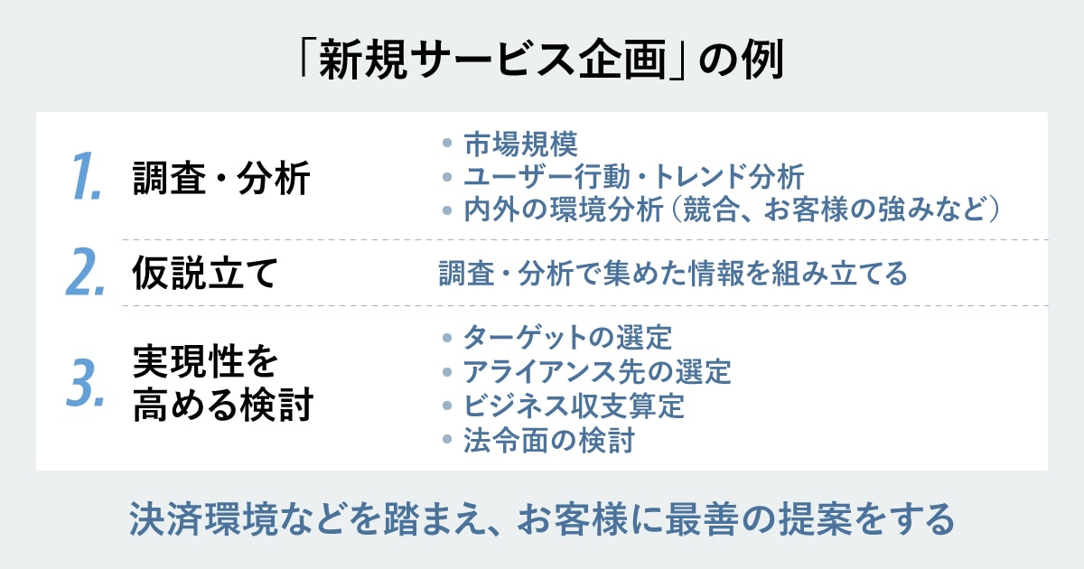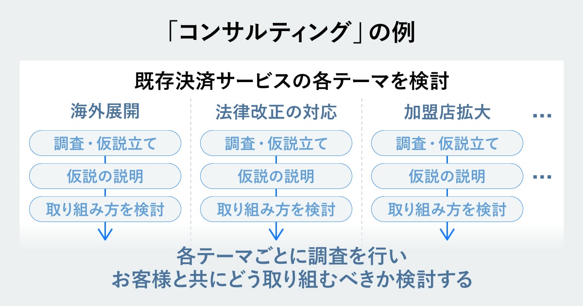 森本:先ほどお話しした通信キャリアのプロジェクトでは、既存の決済サービスにおいて、海外展開、法律改正の対応、加盟店拡大といった複数のテーマが設けられ、そのテーマごとに調査し、仮説を立て、仮説をお客様に説明して各テーマごとに今後どう取り組んでいくべきかを検討する流れで進めていきました。