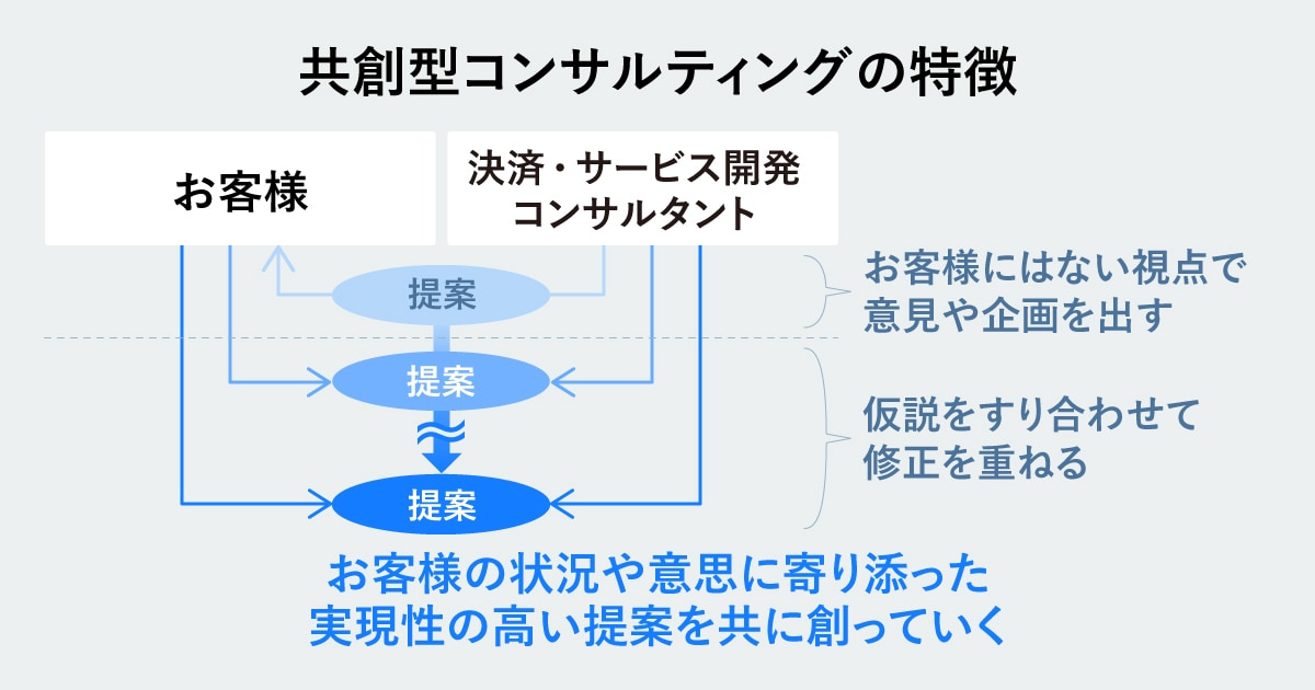 森本:事業会社や金融機関といったお客様に向けて、決済領域の事業開発コンサルティングを行っています。 お客様の決済事業の戦略立案や新規サービスの企画・検討を支援することもあれば、新規サービスの開発やリリースまで伴走をすることもあります。