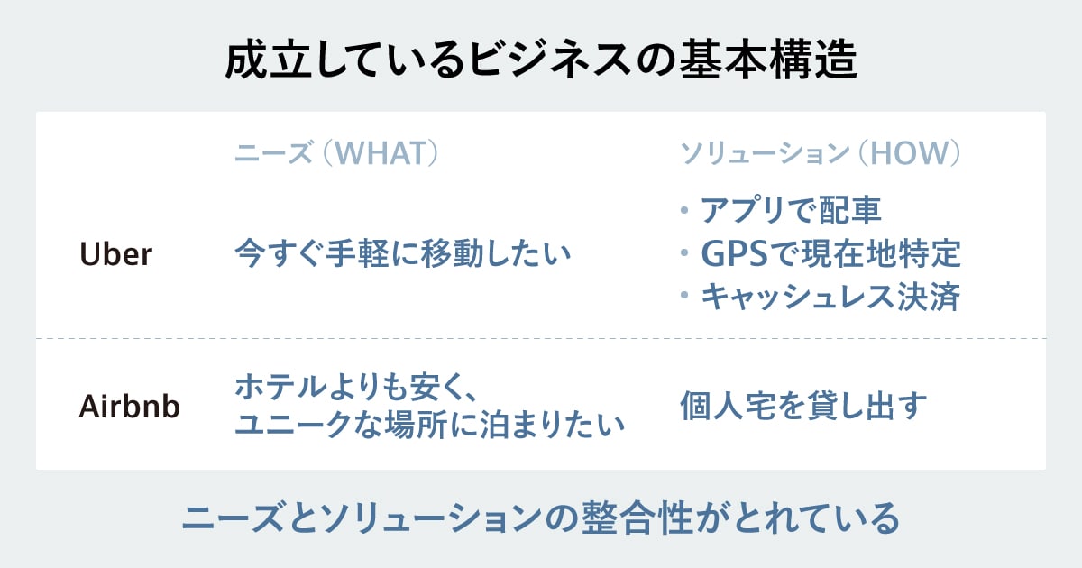たとえばUberは、「今すぐ手軽に移動したい」というニーズに対し「スマホアプリで配車し、GPSで現在地を特定、キャッシュレス決済で支払う」というソリューションで応えています。また、Airbnbは「ホテルよりも安く、ユニークな場所に泊まりたい」というニーズに対し「個人宅を貸し出す」という新しいソリューションを提供したことで、世界的なサービスに成長しました。