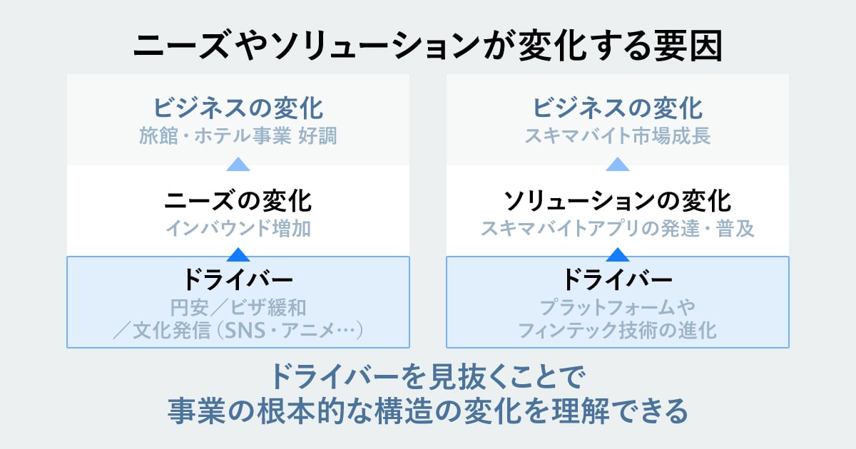 ニーズとソリューションの変化を捉えることは重要ですが、新規事業を考えるためにはより深い思考が必要です。そこでさらに一歩踏み込み、なぜそのニーズやソリューションが変化するのかを考えてみましょう。ニーズやソリューションが生まれ、変化する背景には、必ず「変化の源泉」が存在します。これをビジネスでは「ドライバー(要因)」と呼びます。